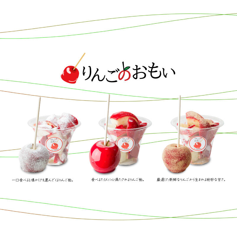 SNSで話題のりんごあめ専門店。関西を中心に15店舗以上ある「りんごのおもい」。創業80年の糖菓工場で特別に作られた極薄あめと、国産にこだわったりんご飴にあう酸味・甘みのバランスのあるりんごを仕入れてコーティングしています。