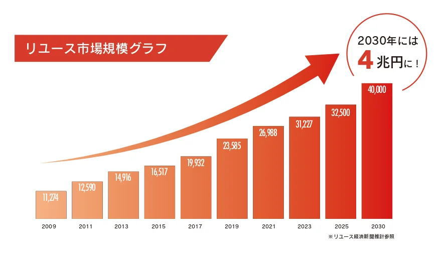 リユース市場、建設市場は右肩上がりで成長しております。職人不足、工具新商品発売、DIY普及、工具下取りサービスの普及に伴い、工具リユース業界の市場規模は年々拡大を続けています。