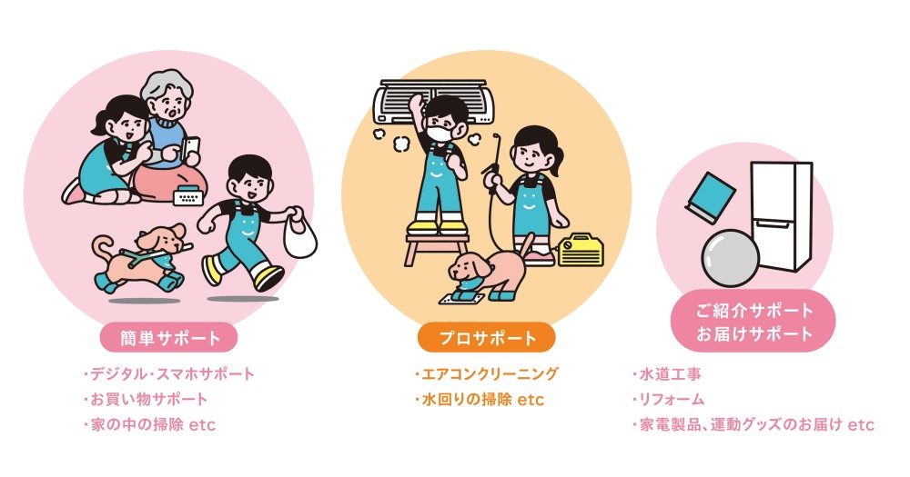 電球交換やお家の掃除などの簡単なものから、プロのサービス提供や専門家のご紹介、