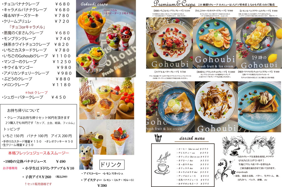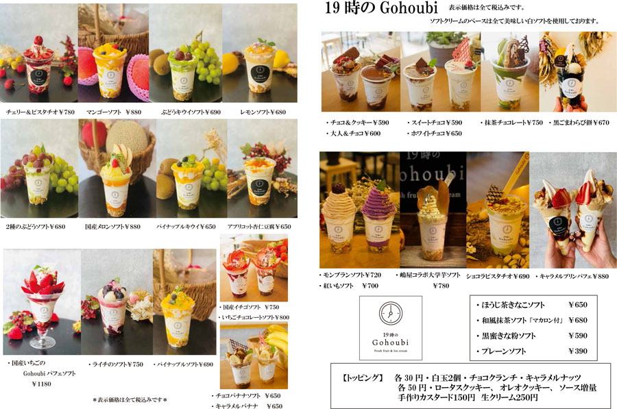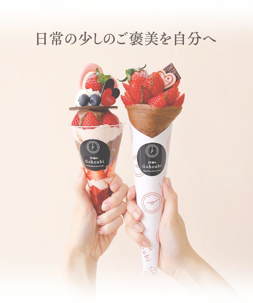 19時いくじのGohoubiは、ソフトクリーム・クレープ・スイーツを提供するお店です。小さいころから親しみのあるデザート、そんな日常の中にあるスイーツにアクセントをつけました。