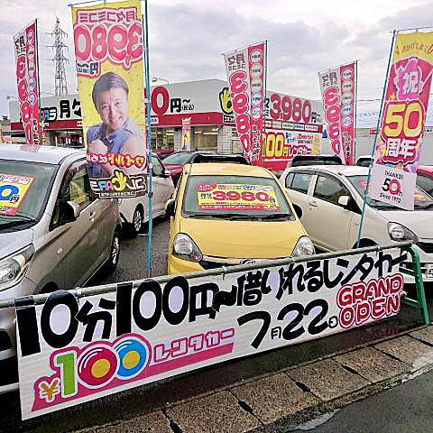 通常、一般のレンタカー会社は新車を登録してレンタカーとしてお客様へ貸し出しますが、100円レンタカーは新車ではなく「中古車」をお客様へ貸し出します。