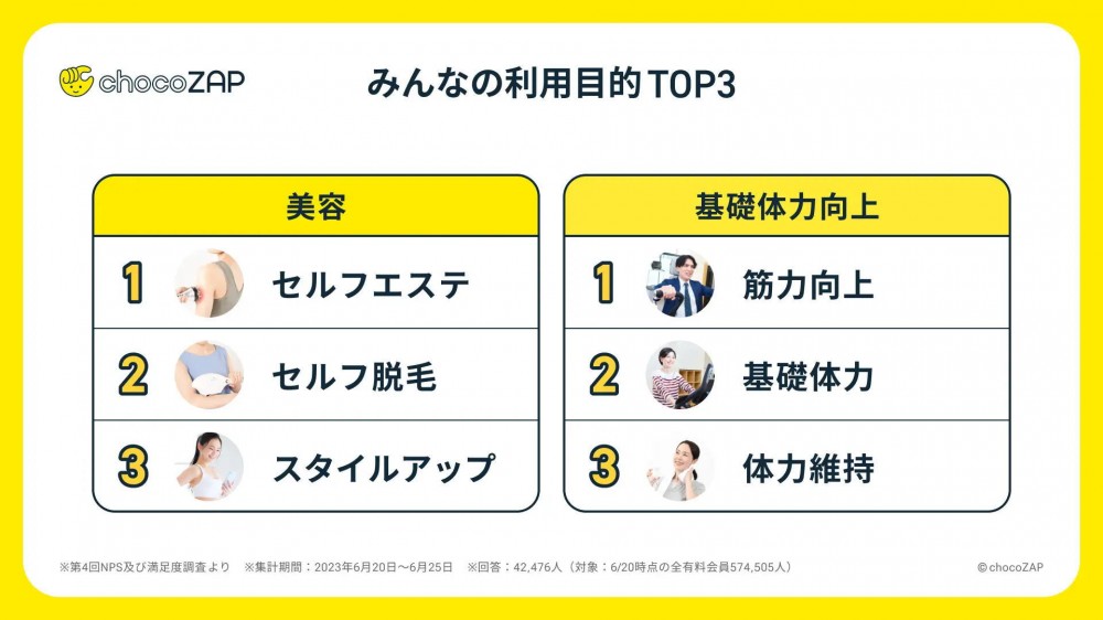 2022年7月にスタートした「chocoZAP」は、「1日5分のちょいトレ・健康習慣プログラム」の開発や、運動のみにとどまらず「美容」「ライフスタイル」「エンターテイメント」など様々な分野のサービス展開を行っており、全国で1,500店舗※2、会員数は120万人※3を突破し、国内フィットネスジム会員数日本一※1を達成しています。「日本中のあらゆる人の声に寄り添い、健康で活力に溢れた社会にコミットし続けることができるサービスをご提供する」ことを目標に、より幅広いお客さまにとって身近な存在として、毎日の生活の中で健康増進に貢献するインフラ的な存在になっていくことを目指しています。