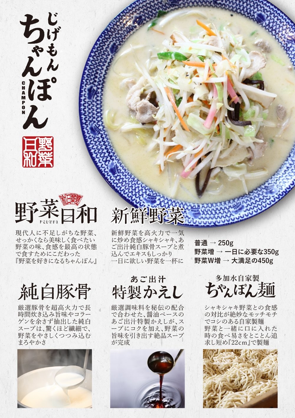 特にスープは、鶏豚骨の深いコクと香りがあり、長崎のスタイルを踏襲しつつも、多様な好みに合わせて毎日でも食べられる「ごちそうちゃんぽん」というジャンルを確立しました。ココロとカラダが喜ぶ「毎日食べたくなるちゃんぽん」を、地元(じげもん)から日本中に、そして世界の人の笑顔と元気をつくる一杯にしていきます。