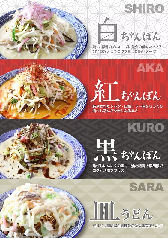 "白" "紅" "黒"の看板ちゃんぽんと皿うどんをはじめ、季節に合わせた期間限定商品も多彩なラインナップを用意しております。また、スープ掛け専用あご玉メシや黒豚一口餃子など幅広い商品展開でお客様を飽きさせない商品開発力が自慢です。
