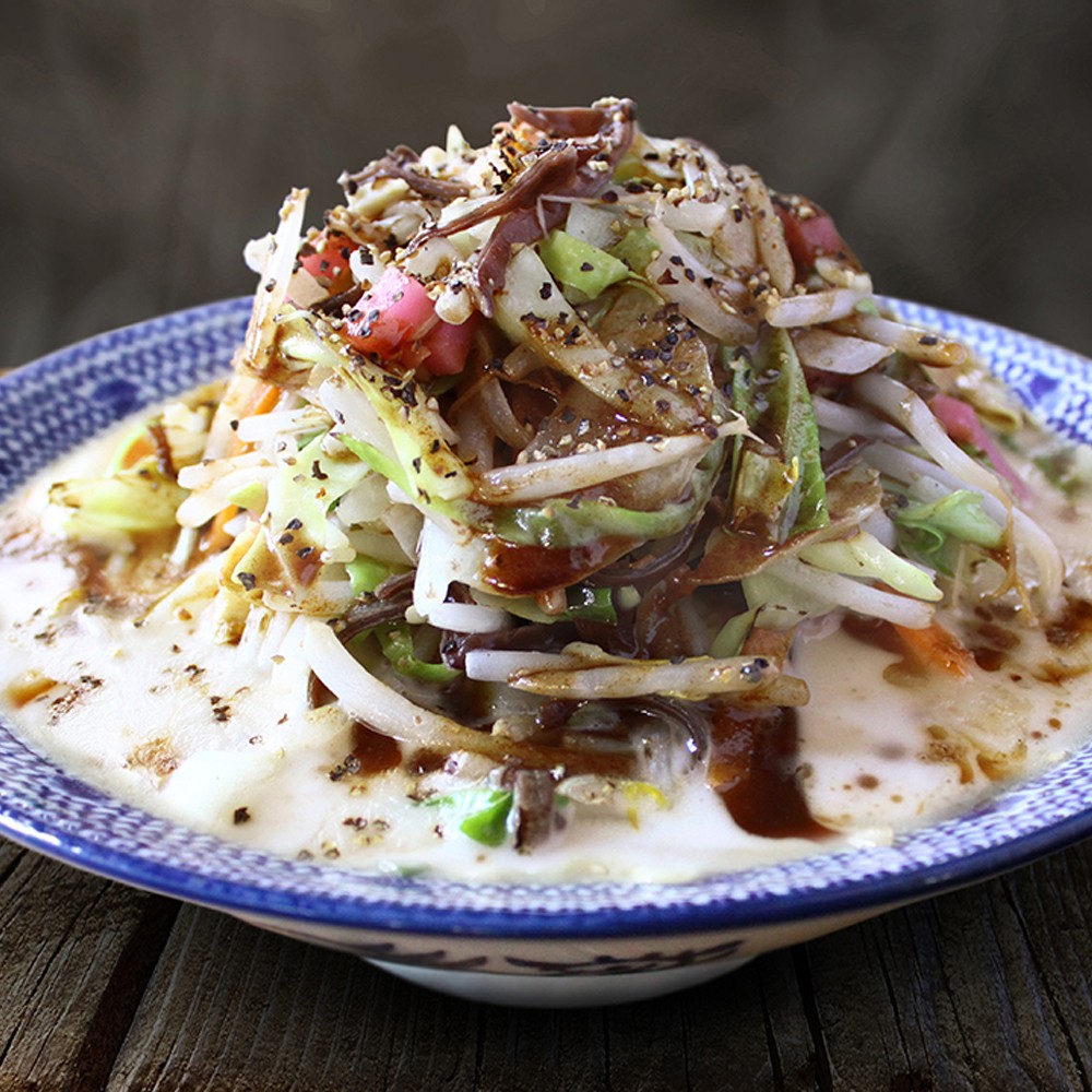その秘密は、高火力で新鮮野菜を一気に炒め、独自の製法で長時間かけて作られた熟成鶏豚骨スープとあご醤油特選かえしと、もっちりした食感を得るために何度も試作を重ね開発した自家製の多加水麺を30秒煮込むことで、独自の美味しさと個性が詰まった「茹でたて、炒めたて、煮込みたて」の一杯となっています。