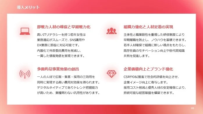 「学歴じゃ無い。私だけのお仕事コレクション」をキャッチコピーに掲げ、これまで学歴によって選択肢が狭まっていた中卒女性の就労機会を広げるとともに、企業の多様な人材ニーズに応え、持続可能な社会づくりに貢献してまいります。