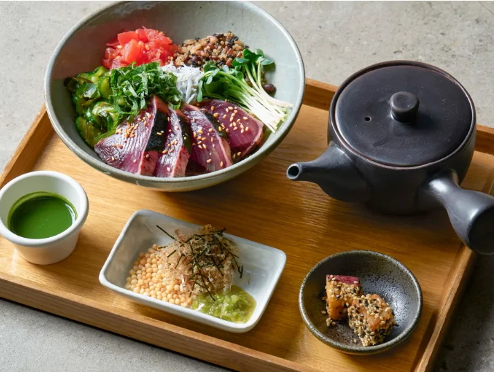 伊右衛門の抹茶漬け(鰹のたたきと佂揚げしらすの抹茶漬け)