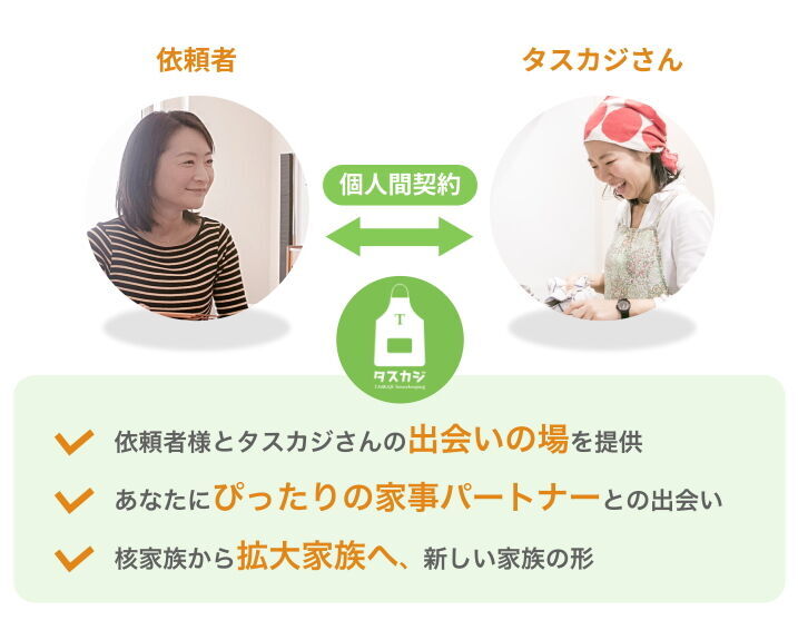 (=タスカジさん)と家事を依頼したい人が出会えるシェアリングエコノミーシステムです。