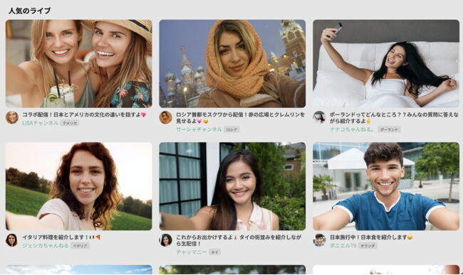 一般的な投げ銭ライブ配信プラットフォームでは「配信者:日本人、視聴者:日本人」の構図ですが、当社おむすびチャンネルでは、配信者は日本語を学習する外国人のみに限定し、「配信者:外国人、視聴者:日本人」の構図となっています。本日時点で、30カ国以上、60名以上の親日外国人が配信者として申請・承認されており、中にはYoutube等で活躍する親日外国人インフルエンサーにも参画表明を頂いております。また将来的には、配信者のカテゴリーを広げていく可能性があります。