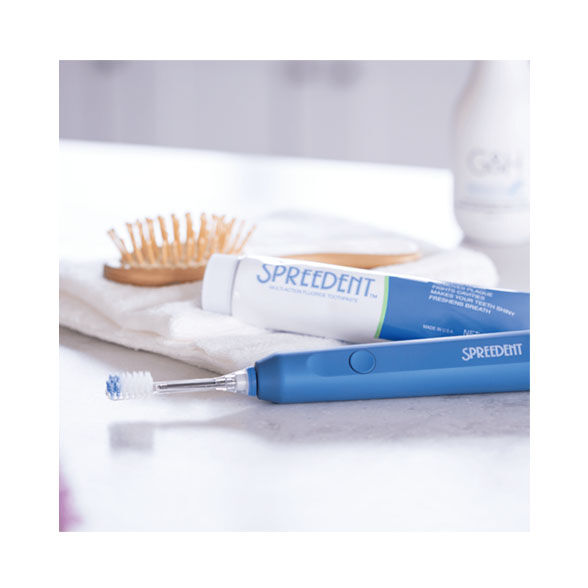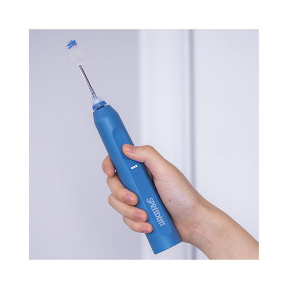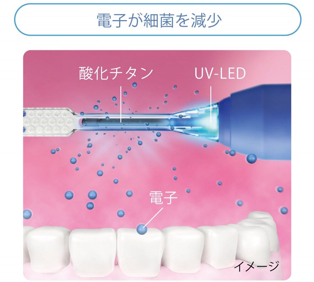 スプリーデント™だけが採用する、UV-LEDと酸化チタン棒、そして微弱電流によって発生する電子の力。歯垢のもととなる歯の表面の細菌を減らし、歯垢をつきにくくします。