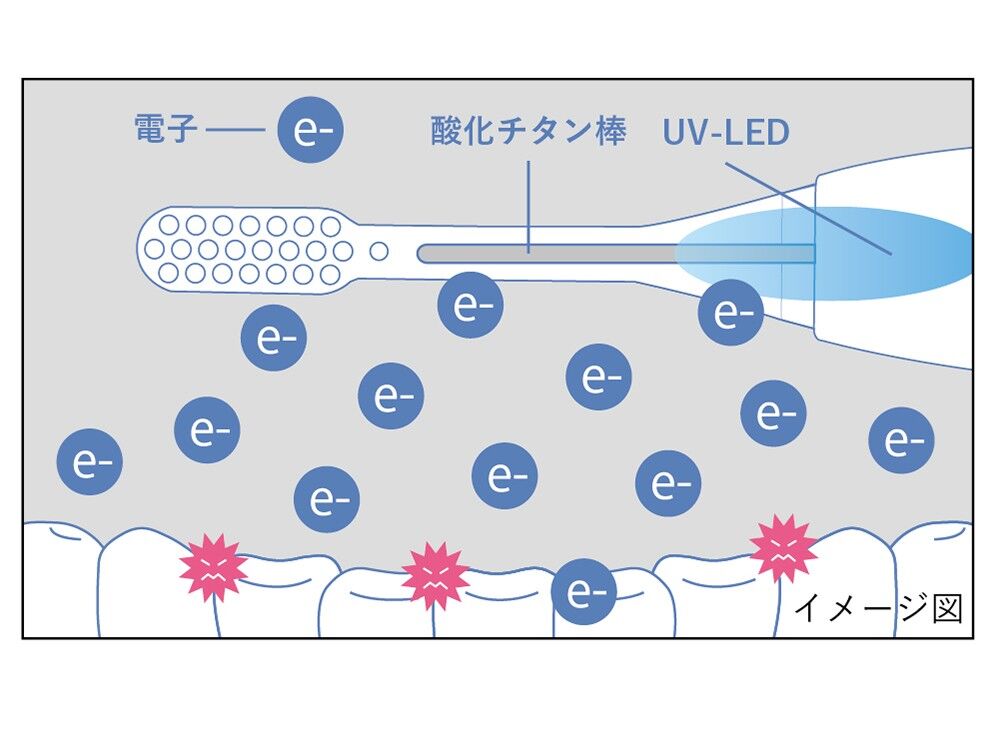 UV-LEDと酸化チタン棒による光蝕媒効果とリチウムイオン電池からの微弱電流で電子が発生。
