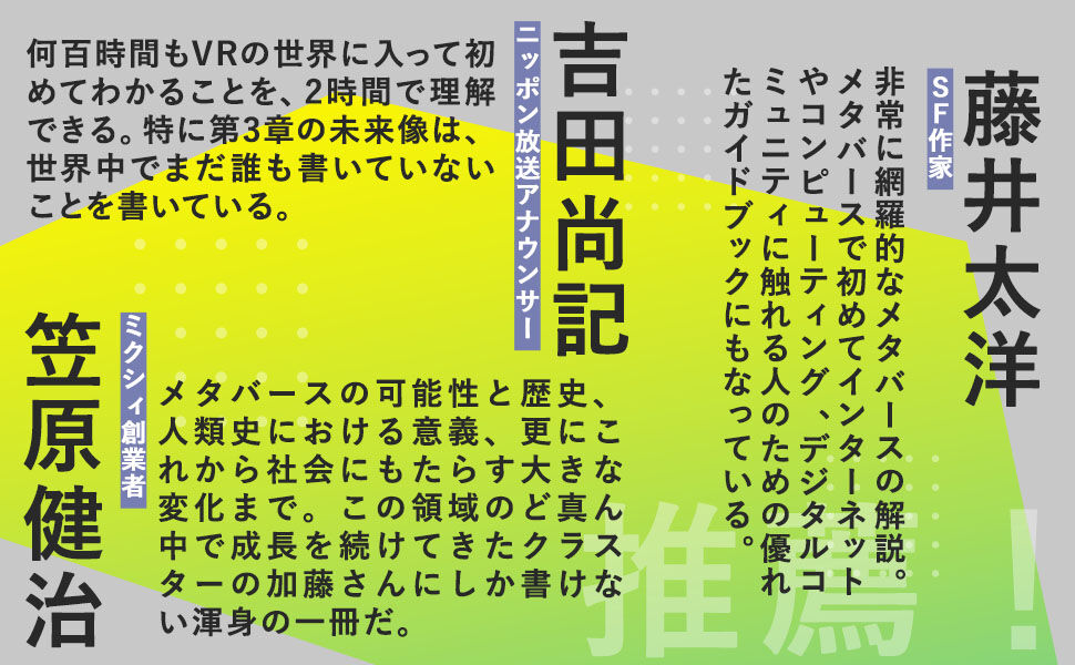 GAFAMがしのぎを削る現状から、VRの歴史や背後の思想、そして驚きの未来像まで、メタバースに関わるすべてを網羅!