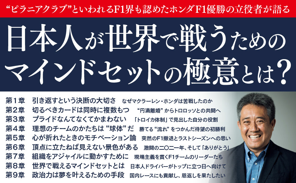 内容例:「ワイガヤ」にはほど遠かった両者の関係/「ウィリアムズ・ホンダ」復活という野望/「マクラーレンと“離婚”しましょう」/ザウバーF1との契約を白紙に戻した真意/部下の「働く喜び」は上司が準備できる/ホンダで学んだ「三現主義」の大切さ/理想のチームとは美しい“球体”だ/ ドライバ―を奮い立たせる「声かけ」のコツ/「放任主義」でチームもスタッフも成長する/「チェコは伝説だ!」が敷いた勝利への布石/感動的な「ホワイトレッドブル」誕生秘話/マルコも絶賛「ユウキの速さは本物だ」/日本人ドライバーが世界で勝てない理由/「いま」という時代に即した普及策を/一朝一夕に「政治の世界」には入れない……ほか