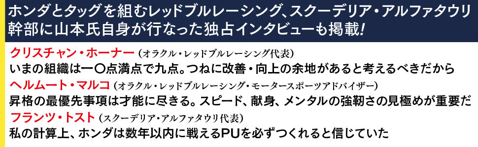 さらに、レッドブルレーシング代表を務めるクリスチャン・ホーナー、ヘルムート・マルコ、フランツ・トスト三氏への、山本氏自身による独占インタビューも掲載。F1ファンはもちろん、リーダーとして組織を率いる方、チームのパフォーマンスを向上させたい方など、すべてのビジネスパーソンに向けた待望の一冊。