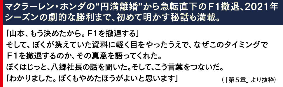 崖っぷちのマクラーレン・ホンダを“円満離婚”へと導き、F1のトップチームであるレッドブルレーシングとのタッグを実現、レッドブル・ホンダとして2021年の劇的なドライバ―ズチャンピオン獲得の立役者となったのが、本書の著者である元ホンダF1マネージングディレクターの山本雅史氏である。