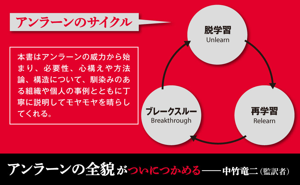 本書はアンラーンの威力から始まり、必要性、心構えや方法論、構造について、馴染みのある組織や個人の事例とともに丁寧に説明してモヤモヤを晴らしてくれる。