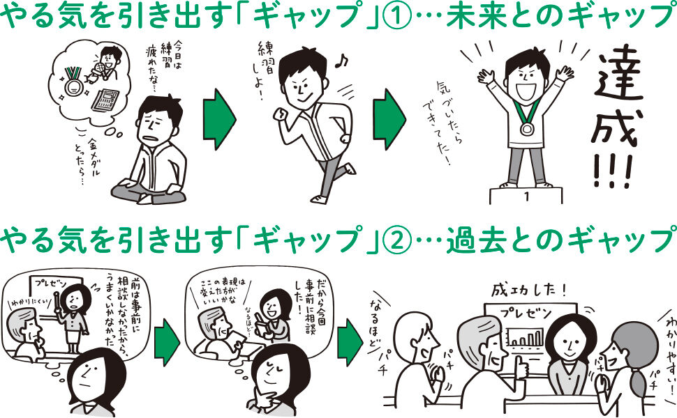 そこで、本書で紹介するのが3つめの「ギャップモチベーション」です。この方法なら、ムリしなくても精神論に訴えなくても、脳科学や神経科学、認知行動科学の力で自然にモチベーションアップします。しかもモチベーションが持続します。