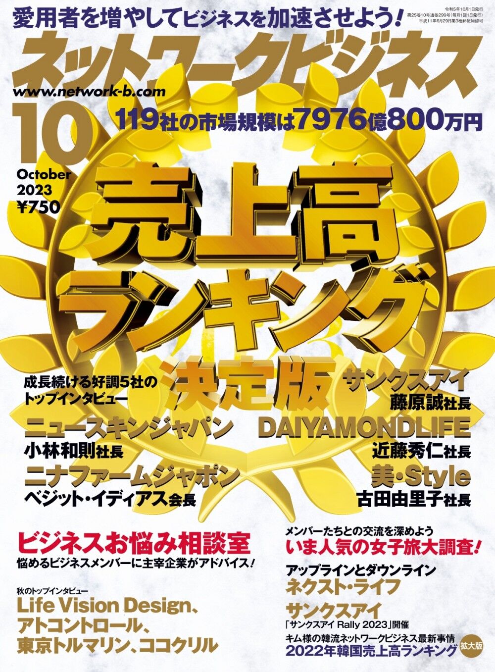 最新10月号の巻頭特集は、「売上高ランキング2023 決定版」。119社の市場規模に加えて、好調5社のトップインタビューも掲載します。ほかにも、「ビジネスお悩み相談室」「いま人気の女子旅大調査!」など、今月も必見の一冊に仕上がりました。
