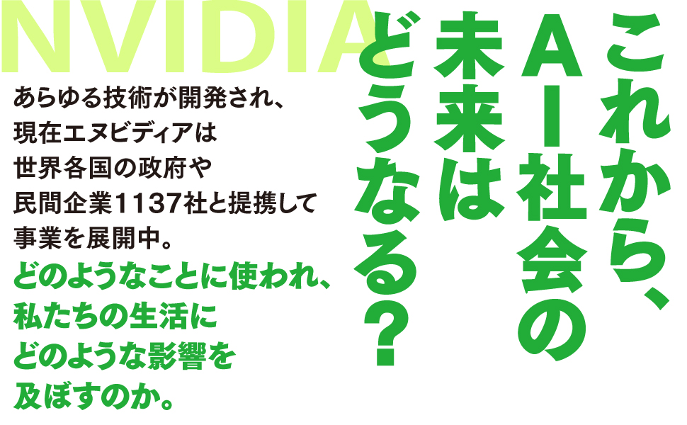 あらゆる技術が開発され、現在エヌビディアは世界各国の政府や民間企業1137社と提携して事業を展開中。どのようなことに使われ、私たちの生活にどのような影響を及ぼすのか。 時価総額世界一の“化け物”は、何を考えているのか。