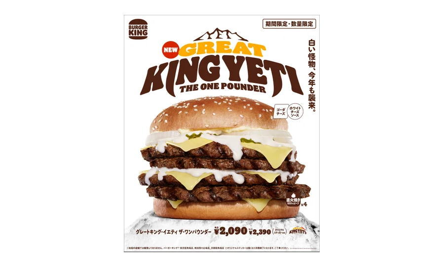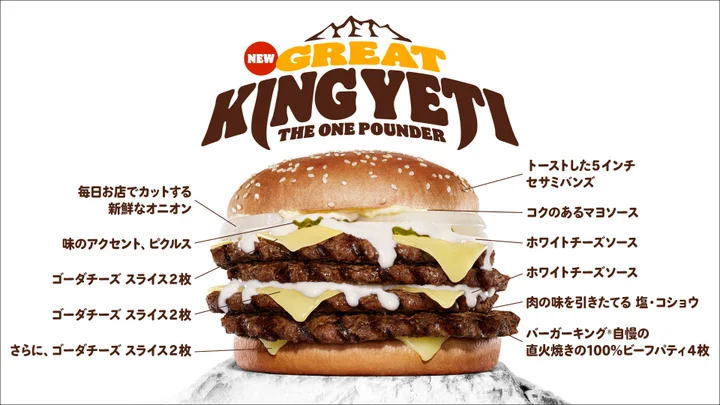 バーガーキング® からモンスター級の超大型チーズバーガー『グレートキング・イエティ ザ・ワンパウンダー』が今年も襲来!直火焼きビーフ4枚とゴーダチーズ6枚にたっぷりのホワイトチーズソース