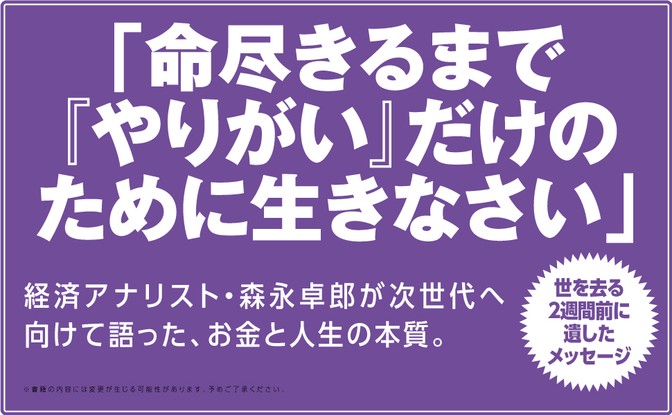 私は、「やりがいだけのために生きる」ことこ そが、真の幸福だと確信しています。資本の奴隷として、金銭的な豊かさを追い求め続けても、ただ疲弊するばかりで、その先に幸せな人生はありません(「はじめに」より)。経済アナリ スト・森永卓郎が次世代へ向けて語った、お金と人生の本質。