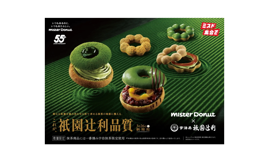 この度発売します『Mister Donut×祇園辻利 第一弾』は宣言後、初の新商品となります。9年目のコラボレーションとなる祇園辻利の宇治抹茶をふんだんに使い、抹茶の味わいはもちろん、食感にもこだわった生地、和素材との組み合わせでお楽しみいただける商品を展開しております。