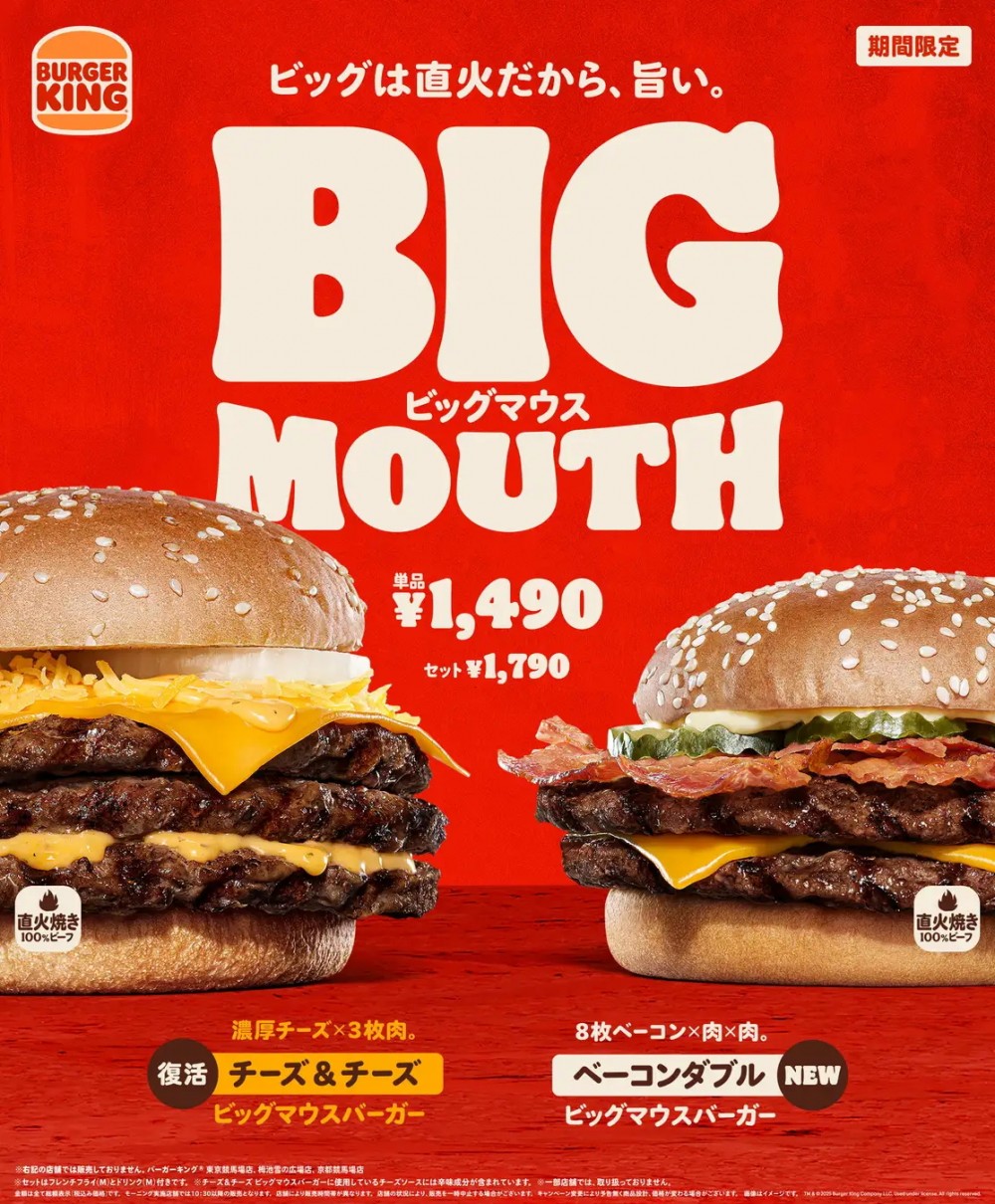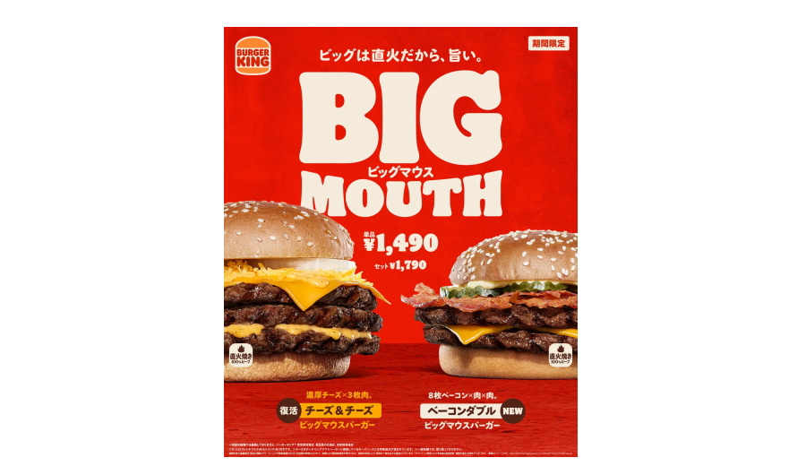 バーガーキング® から大人気シリーズ“ビッグマウス”登場! 直火焼きビーフパティ3枚に濃厚チーズの売上No.1「チーズ&チーズ」復活!たっぷり8枚ベーコンにダブルビーフ「ベーコンダブル」新発売!