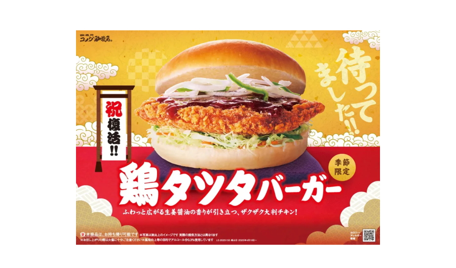 全国にフルサービス型の喫茶店を展開する株式会社コメダ[本社:愛知県名古屋市、代表取締役社長:甘利 祐一、グループ店舗数:1,113店舗(2025年3月末時点)]は、全国のコメダ珈琲店で2025年4月16日(水)から「鶏タツタバーガー」を季節限定で販売いたします。