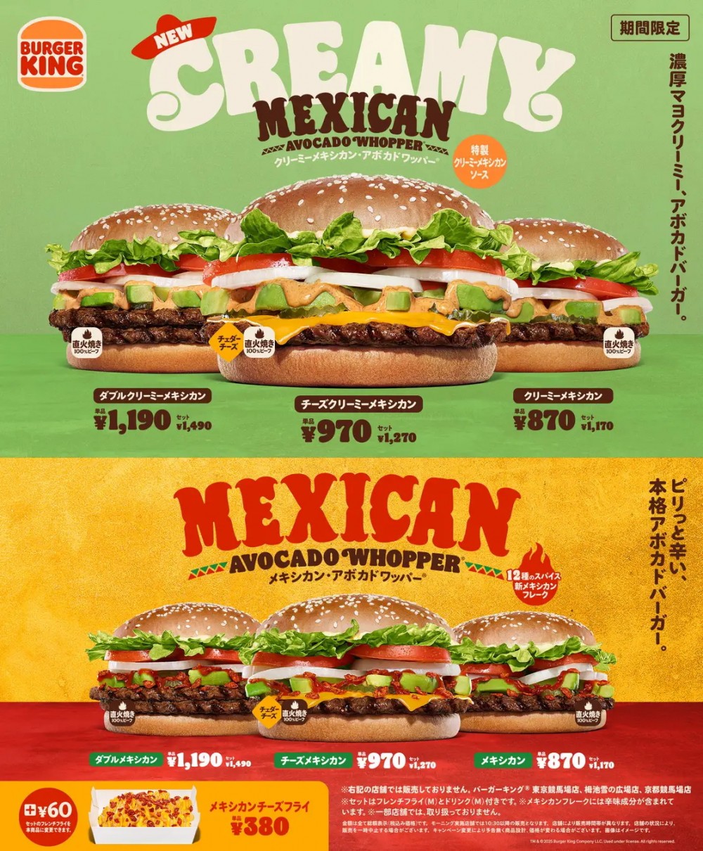 バーガーキング® ファンの皆様も、メキシカン料理好きの皆様も、バーガーキング® に新登場する本格メキシカンのスパイスを使用した濃厚なおいしさが楽しめる新開発「特製クリーミーメキシカンソース」で仕上げた『チーズクリーミーメキシカン アボカドワッパー® 』『クリーミーメキシカン アボカドワッパー® 』『ダブルクリーミーメキシカン アボカドワッパー® 』3商品、そして、ピリッとした辛さとコクのあるチーズに手が止まらないおいしさ『メキシカンチーズフライ』をぜひこの機会にお楽しみください。