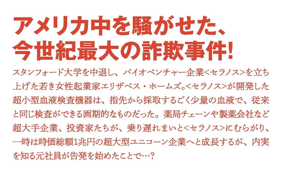 現代社会の様々な側面が凝縮したシリコンバレー発巨大詐欺事件の全容を、敏腕記者が地道な取材で証言を積み重ねながら、暴いていく。