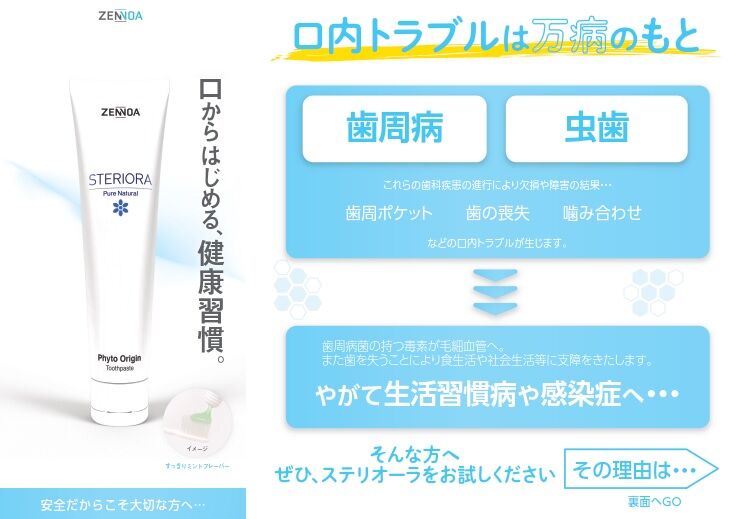 口腔トラブルは万病の元です。歯周病、むし歯、口臭は放っておくと健康をも蝕んでしまいかねません。「STERIORA」を日々の生活に取り入れ、口内環境をキレイに整えましょう。