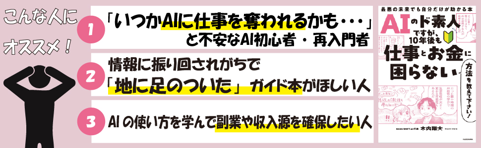 「日本をAI先進国に」を掲げAIのビジネス活用を学べる利用者数No.1※のAI大学「SHIFT AI」を運営する株式会社SHIFT AI(東京都渋谷区)代表取締役 木内翔大は、『AIのド素人ですが、10年後も仕事とお金に困らない方法を教えて下さい! 最悪の未来でも自分だけが助かる本』を株式会社KADOKAWAより2025年5月21日に発売いたします。昨今、AI技術の急速な進化と普及により、私たちの仕事や生活は大きな変革の時を迎えています。本書は、AIに関する専門知識がない方でも、来るべきAI時代を生き抜き、仕事とお金に困らないための具体的な方法と考え方を提示する一冊です。