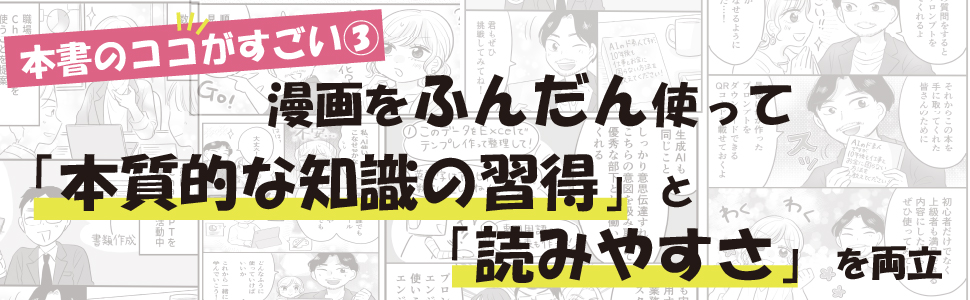 AIに関する漠然とした不安や疑問を、親しみやすい漫画形式でストーリー仕立てに展開し、読者の関心を引き出します。