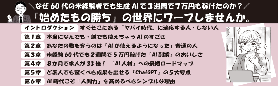 このような「ヤバイ時代」において、AIの知識がない人々がどうすれば生き残れるのか、そしてAIをどのように活用すればキャリアアップや収入増に繋げられるのか。その具体的な道筋を示すべく、AI教育の第一人者である当社代表取締役の木内が誰にでも実践可能なノウハウを凝縮して本書を執筆しました。AIに対する漠然とした不安を具体的な行動に変えるための一助となることを目指しています。