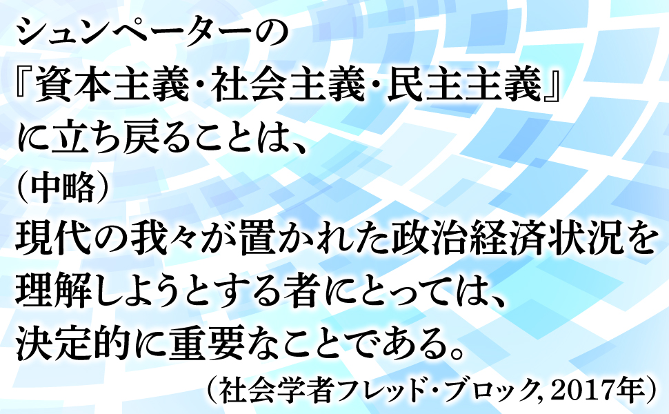 「七十五年後に、シュンペーターの『資本主義・社会主義・民主主義』に立ち戻ること は、骨董いじりなどではまったくない。その反対に、現代の我々が置かれた政治経済状況を理解しようとする者にとっては、決定的に重要なことである」