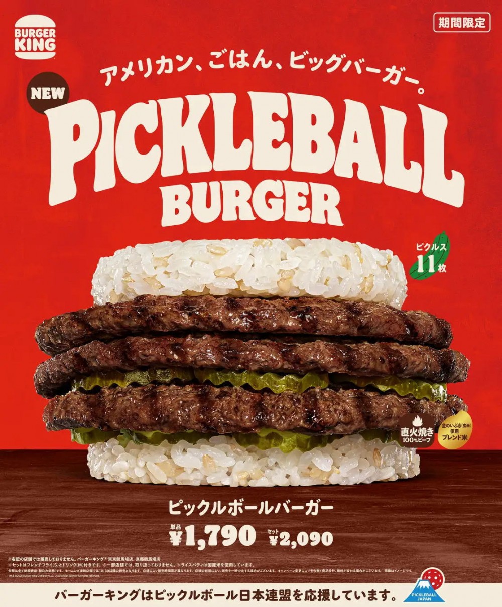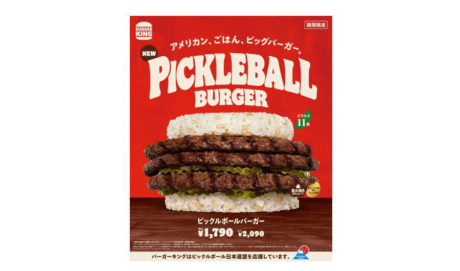 バーガーキング® ファンの皆様も、ピックルボール好きの皆様も、お肉とお米のおいしさを存分にお楽しみいただける、アメリカンな大型ごはんバーガー『ピックルボールバーガー』をぜひご体験ください。
