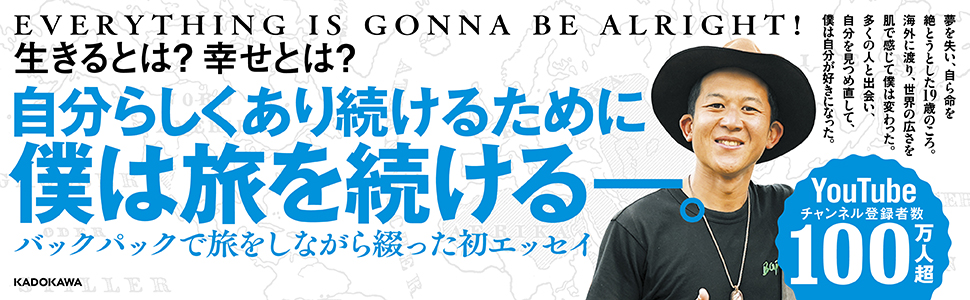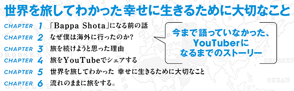 夢を失い、自ら命を絶とうとした19歳のころ。あるきっかけで海外に渡り、考え方が変わった――。チャンネル登録者数100万人超のYouTuber、Bappa Shota(バッパー・ショウタ)の初著書は、バックパックで旅をしながら綴った価値観がゆすぶられるリアルストーリー。世界を旅してわかった“幸せに生きるために大切なこと”を、この本を通じてみなさんにシェアします。