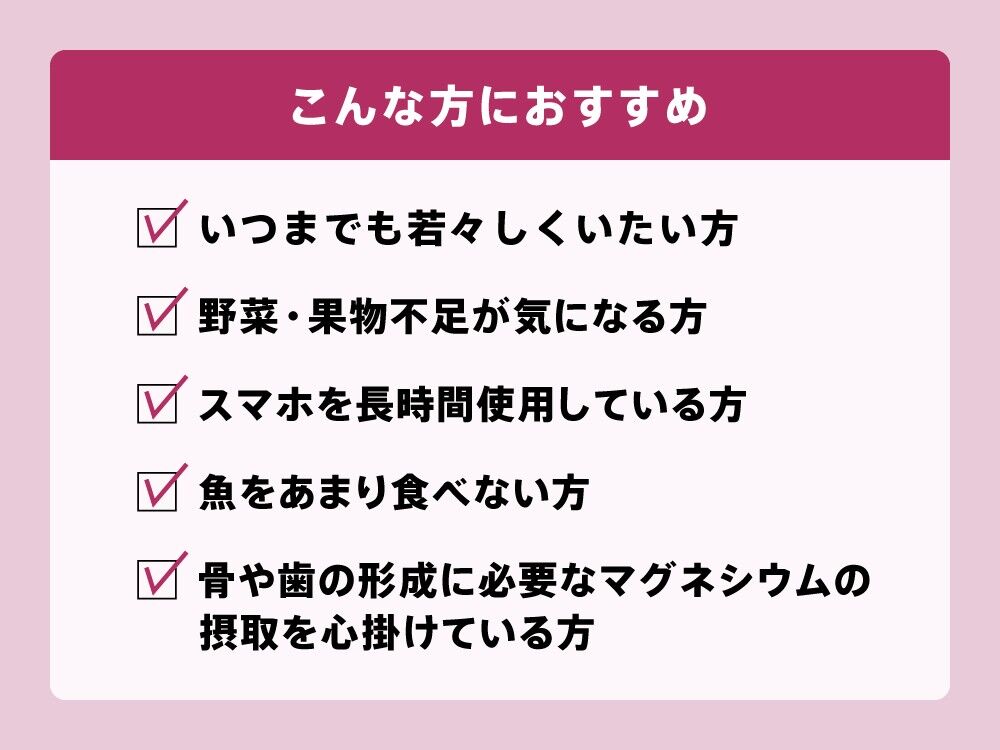 食品ですのでいつお召し上がりいただいてもかまいませんが、1日2袋を目安に水とともにお召し上がりください(例えば、朝食とともに1袋、夕食とともに1袋など)。