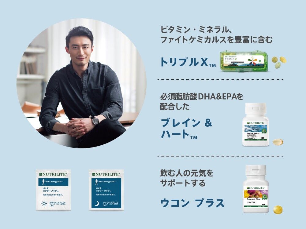 毎日、多忙……そんな働き盛りの男性のライフスタイルをサポートする、3つのサプリメントを厳選。ビタミン・ミネラル、ファイトケミカルスを豊富に含むトリプルX™。必須脂肪酸DHA&EPAを配合したブレイン&ハート™。飲む人の元気をサポートするウコン プラス。おすすめのサプリメント1回分を個包装にしました。