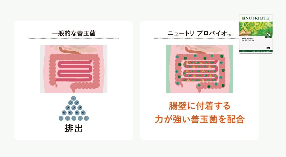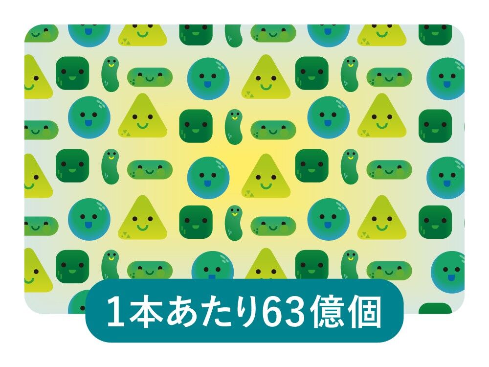 小腸・大腸まで生きて届くのは当たり前。「ニュートリ プロバイオ™」は、腸内にとどまり定着する5種類の乳酸菌・ビフィズス菌を配合したサプリメントです。1本あたり、63億個の善玉菌を含有しています。