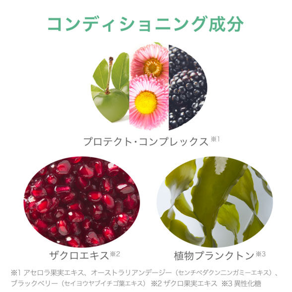 ※コンディショニング成分: アセロラ果実エキス、オーストラリアンデージー(センチペダクンニンガミーエキス)、ブラックベリー(セイヨウヤブイチゴ葉エキス)