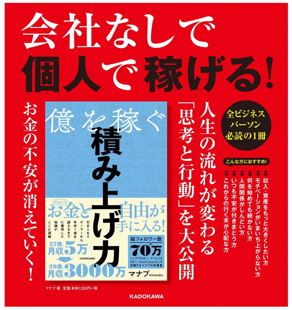 自動的に頑張る方法/「副業で月5万」を稼ぐ/仕事で成長するための3原則/比べるべきは、半年前の自分です/継続するためには、捨てる勇気も必要/お金を「稼げる人」と「稼げない人」の違い/個人が、大企業と対等に戦える時代がくる…ストレスなしで、場所も人間関係も気にせず生きていける稼ぐ×継続×不屈の思考法。引きこもりゲーマーから年収1億を超えるまでに獲得した知識が凝縮。トップブロガー、アフィリエイター、YouTuberとして活躍するマナブの初著書。