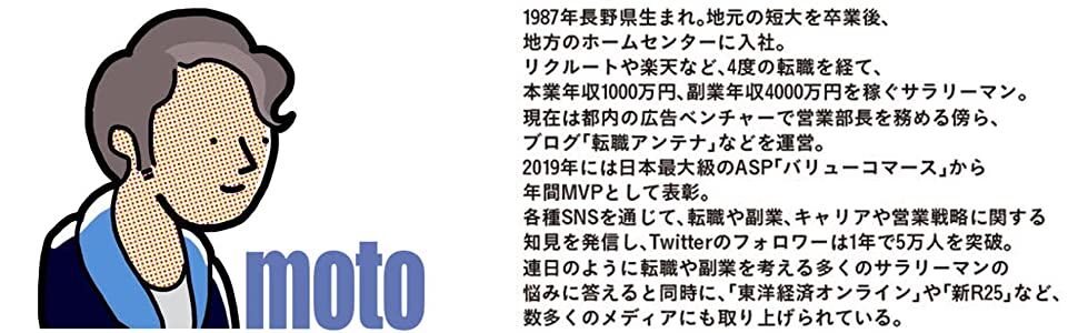 著者のmoto氏は、長野県出身の32歳。新卒で地方ホームセンターに入社し、レジ打ちからキャリアをスタート。現在は広告ベンチャーで営業部長をする傍ら、Twitter、ブログ、note、voicyなどを通じて独自のキャリア論を発信しています。
