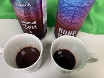 味はノニ+Aな 感じですかね。 色は写真のとおりです。ヌクヒバと飲み比べてみました。向かって左がヌクヒバZENです。向かって右がヌクヒバです。ヌクヒバとはまた違ったかんじでした。こちらの方が好みな味です。