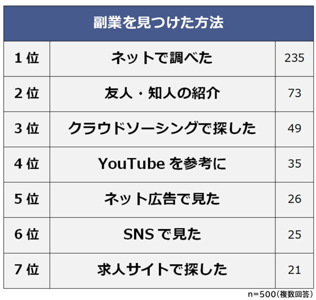 本業の隙間時間に副業した経験がある500名に「副業の見つけ方」を聞いたところ、1位は「ネットで調べた(235人)」でした。