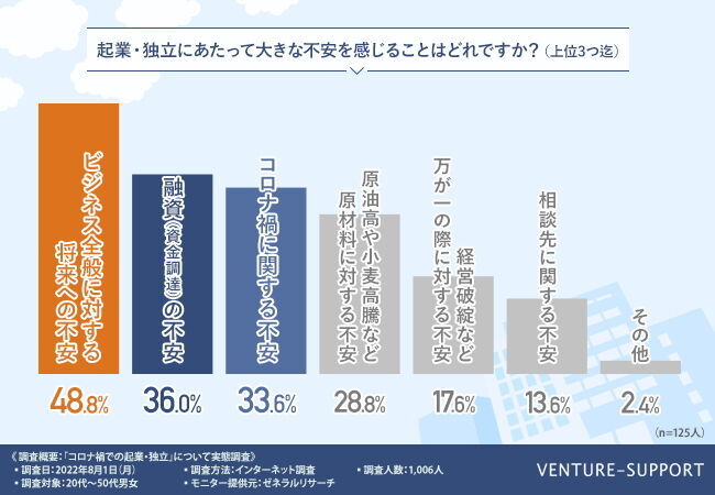 起業・独立にあたっての不安としては、「ビジネス全般に対する将来への不安」が最多となった