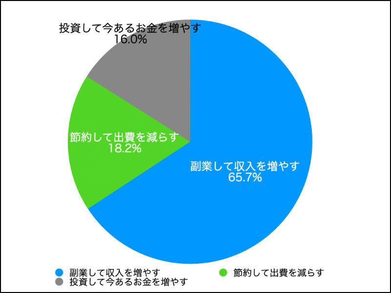 節約したり、投資してお金を増やす意見は2割以下となり、女性181人のうち6割以上の人は「お金増やす」なら副業するのが良いと考えていることがわかりました。