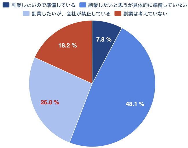 ◯副業したいので準備している ◯副業したいと思うが具体的に準備していない ◯副業したいが、会社が禁止している ◯副業は考えていない