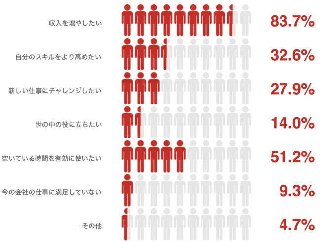 - ▶︎ 副業したい理由は、「収入を増やしたい」「空いている時間を有効に使いたい」