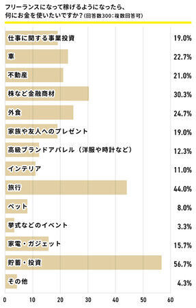 会社員に、もしフリーランスになったら重視することを聞いたところ、「今より稼ぎたい」という回答が最多となり、具体的には「今の年収の1.5倍以上」という回答が目立ちました。“フリーランスは収入が不安定”といったイメージが薄れ、「フリーランス=より稼げる」という前向きなイメージを持っている人が増大していることが予想されます。稼げるようになったら具体的にどんなことにお金を使いたいのかを聞くと、「貯蓄・投資」がトップとなり、「株などの金融商材」「旅行」なども票を伸ばしました。